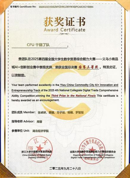 2025年10月24日,第四届尼奥尼全国大学生数字贸易综合技能大赛“义乌中国小商品城AI+创新创业赛”在浙江义乌举行,我们“CPU干烧了队”荣获...