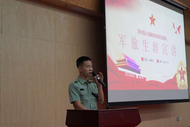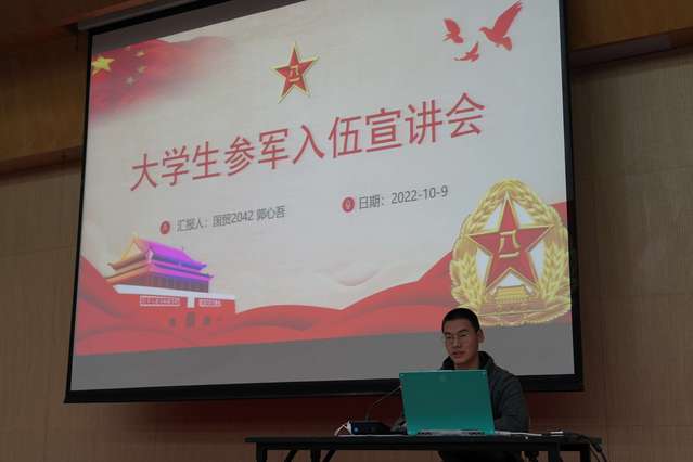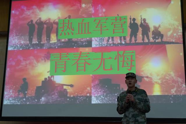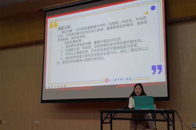 大会伊始,辅导员祝琴为大家全面地讲解了大学生参军优惠政策,围绕入伍条件、优先优待、选拔培养、复学升学四个方面进行。随后,退伍大学生郭心吾通过几段视频回忆自身的军旅生涯,生动形象展现海军部队,廖兴威结合自身部队生活讲述参军情怀,周其隆介绍了海陆空三军及武警的特点,喻豪杰分享在军营的收获和感动。