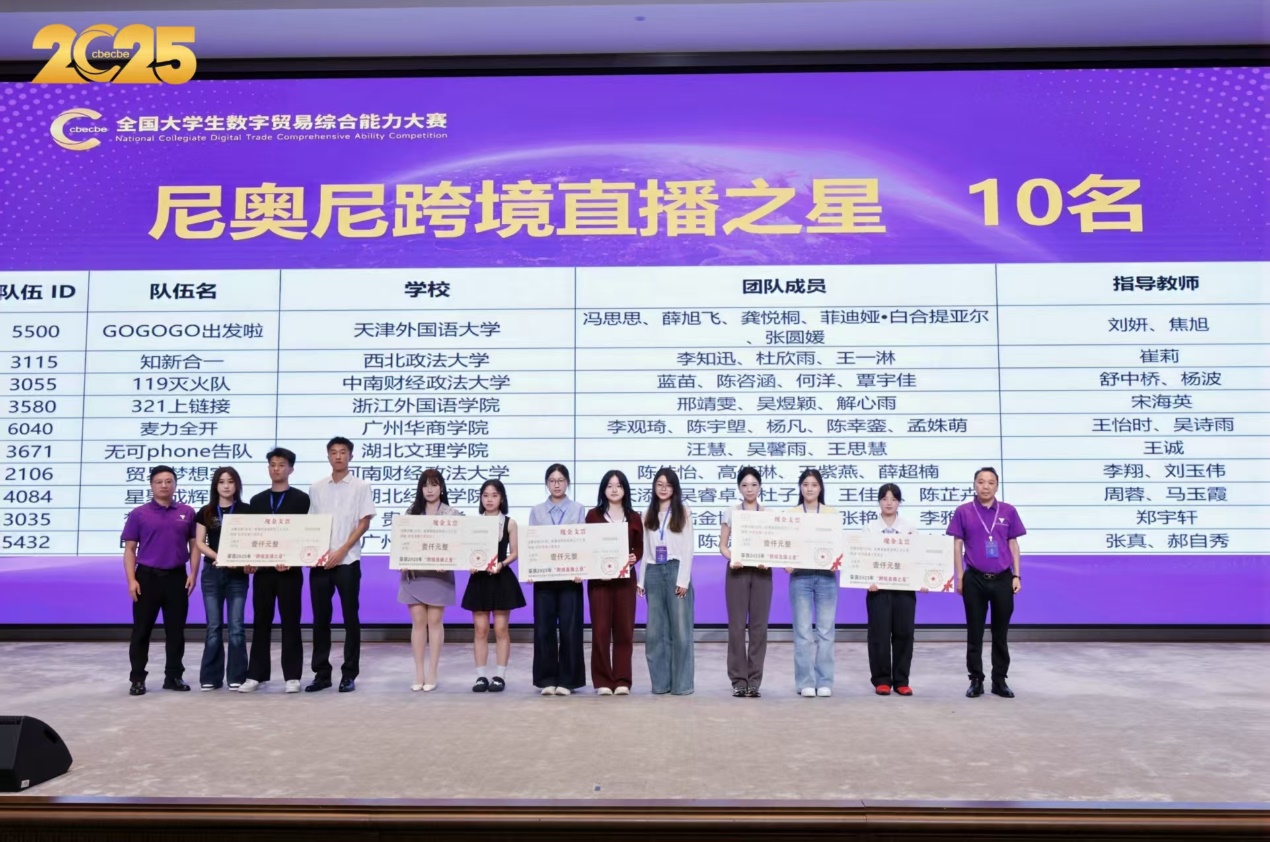 2025年9月28日,第四届尼奥尼全国大学生数字贸易综合技能大赛跨境直播赛道全国总决赛颁奖典礼在浙江大学紫金港校区举行,我们“星聚成辉队”在全国总决赛中强势突围,荣获全国二等奖。