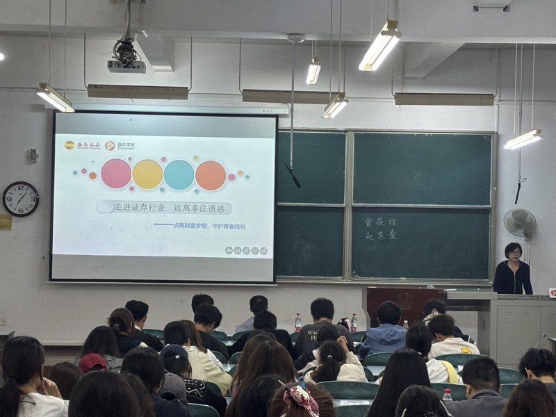 为搭建校企沟通桥梁,帮助25级经济学学子洞悉金融行业前沿动态,提升金融安全意识,11月2日晚,我们特邀国内知名券商西南证券湖北分公司开展“走进证券行业 远离非法诱惑”专题宣讲会。