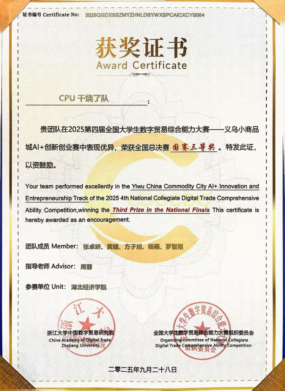 2025年10月24日,第四届尼奥尼全国大学生数字贸易综合技能大赛“义乌中国小商品城AI+创新创业赛”在浙江义乌举行,我们“CPU干烧了队”荣获全国三等奖。